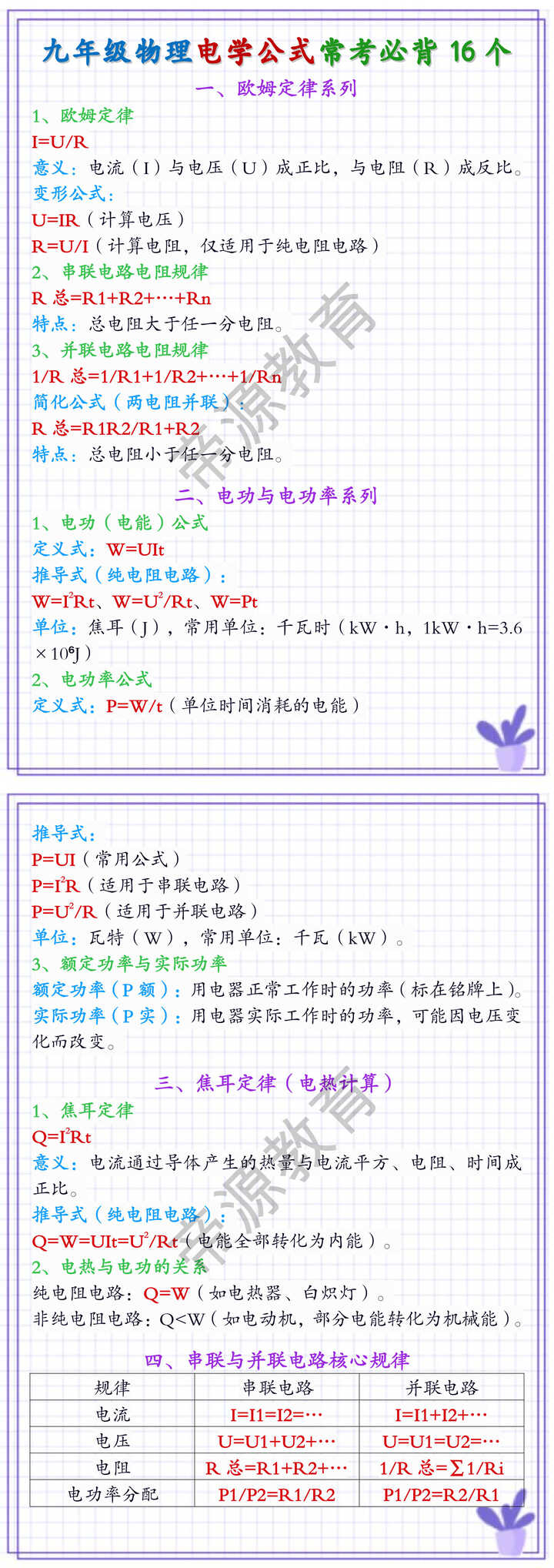 九年级物理电学公式常考必背16个