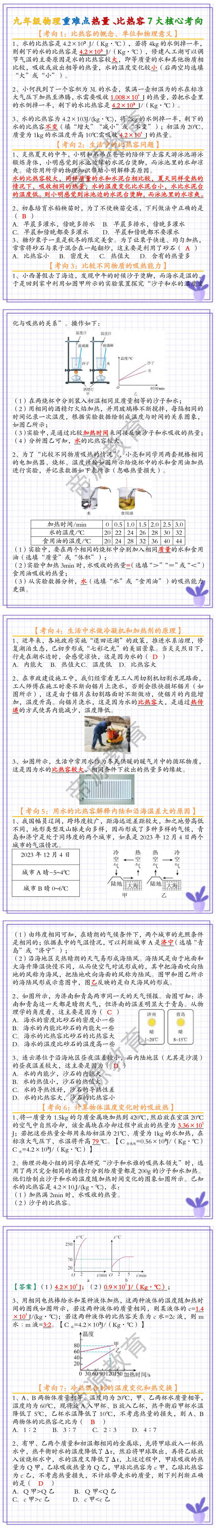 1、水的比热容是4.2×10³ J/(Kg·℃),若将4kg的水倒掉一半,则剩下的水的比热容是4.2×10³ J/(Kg·℃),修建人工湖可以调节气温的主要原因是水的比热容较大,即等质量的水和其他物质相比较,吸收或放出相等的热量,水的温度变化较小(后两空均选填“大”或“小”)。