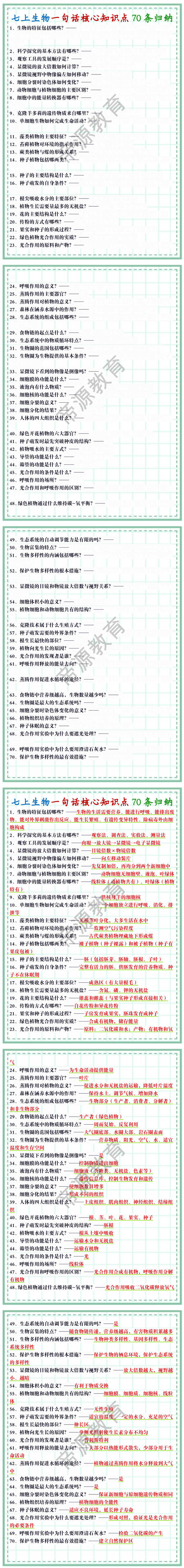 1、生物的特征包括哪些?——生物的生活需要营养、能进行呼吸、能排出废物、能对外界刺激作出反应、能生长繁殖、有遗传变异特性、除病毒外由细胞构成