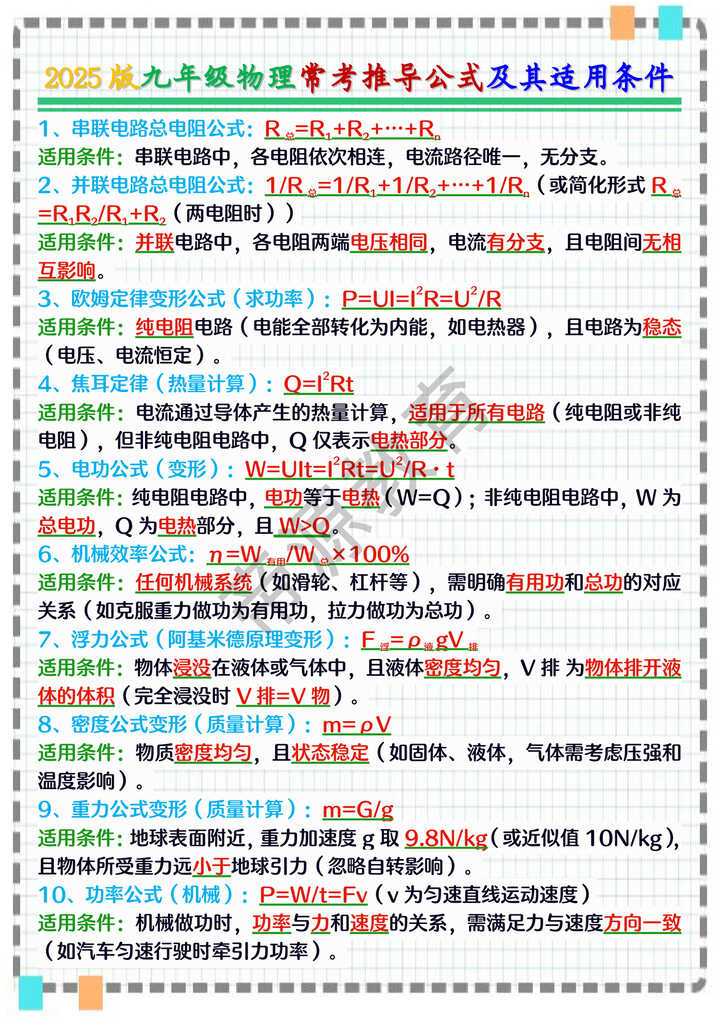 适用条件:电流通过导体产生的热量计算,适用于所有电路(纯电阻或非纯电阻),但非纯电阻电路中,Q 仅表示电热部分。
