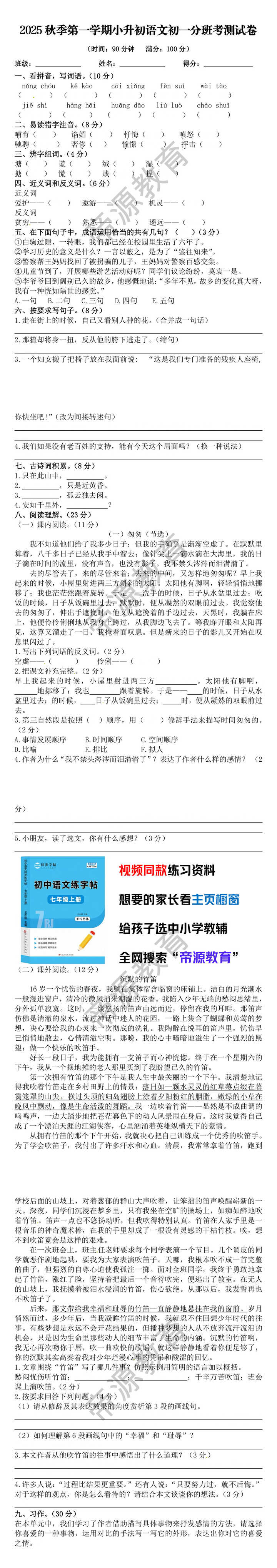 2025秋季第一学期小升初语文初一分班考测试卷