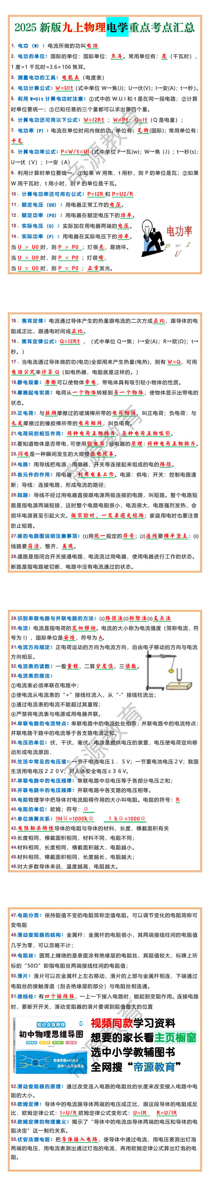 8. 计算电功率公式:P=W/t=UI(式中单位P→瓦(w);W→焦(J);t→秒(s);U→伏(V);I→安(A)