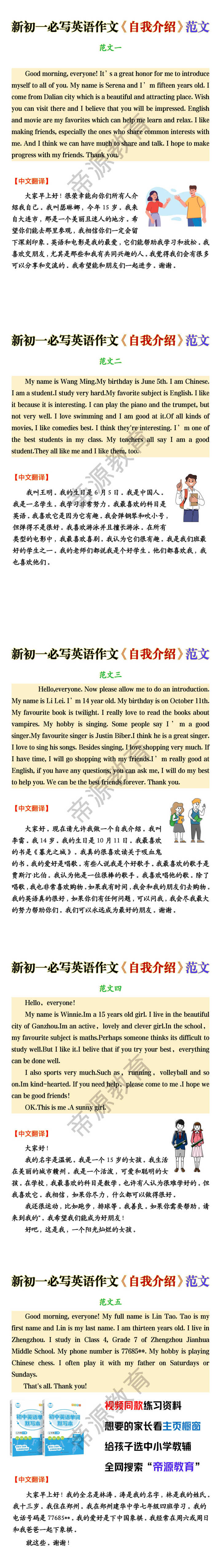 Good morning, everyone! It’s a great honor for me to introduce myself to all of you. My name is Serena and I’m fifteen years old. I come from Dalian city which is a beautiful and attracting place. Wish you can visit there and I believe that you will be impressed. English and movie are my favorites which can help me learn and relax. I like making friends, especially the ones who share common interests with me. And I think we can have much to share and talk. I hope to make progress with my friends. Thank you
