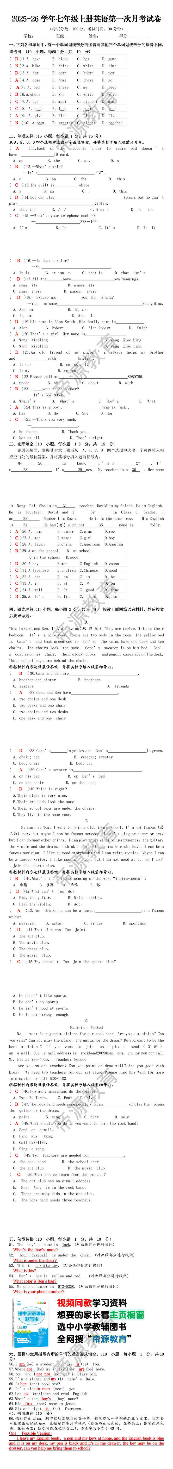 ( B )10. A.team B.sweater C.please D.teacher