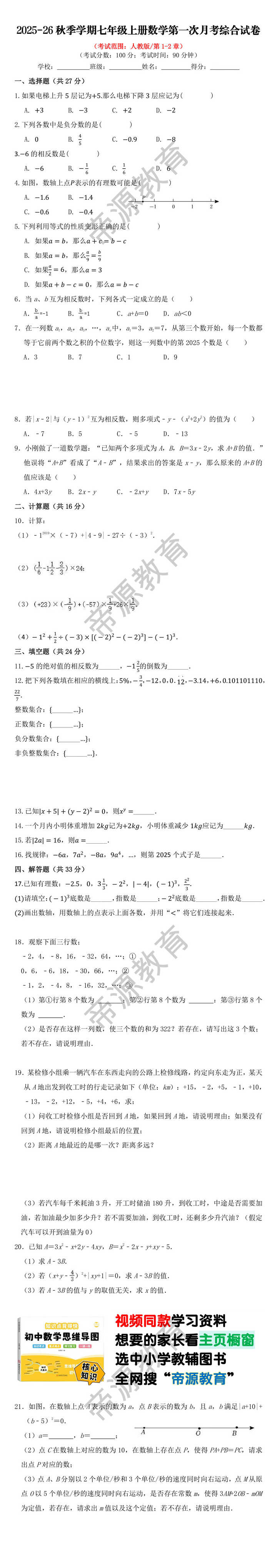 2025-26秋季学期七年级上册数学第一次月考综合试卷