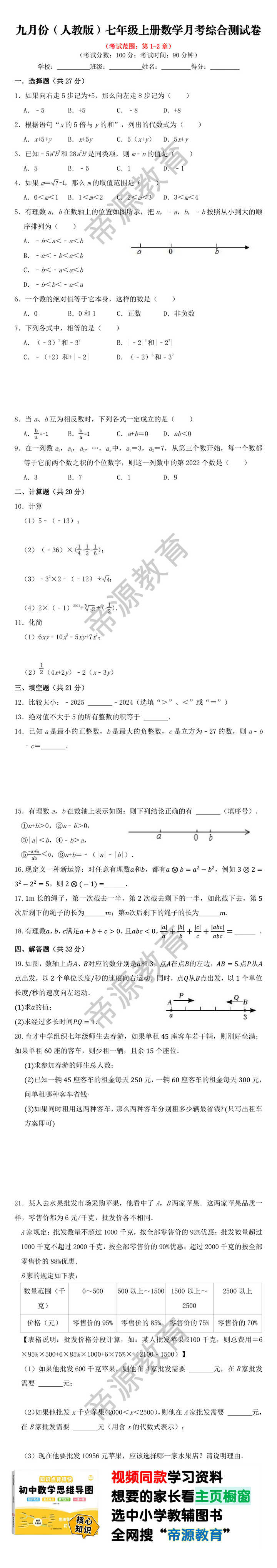九月份(人教版)七年级上册数学月考综合测试卷